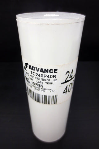 New, no box. Internal discharge resistor by Advance, model 7C240P40R. Specifications: 400 VAC, 50/60 Hz, 195°C maximum temperature, 24 MFD, no PCB's. Pre-owned and tested industrial surplus from a closing plant in Quebec, Canada.
