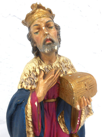 Tall 11 3/4 inches, excellent condition. All made in paper maché, original colors. No chips, only a few spots of color missing. Identified under its base, marked Made in Italy. Much bigger than the usual manger figurines. Beautiful details and facial expression. Notice his hand in particular. Hard to find in this condition.