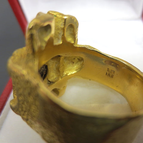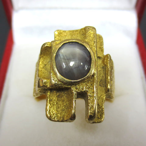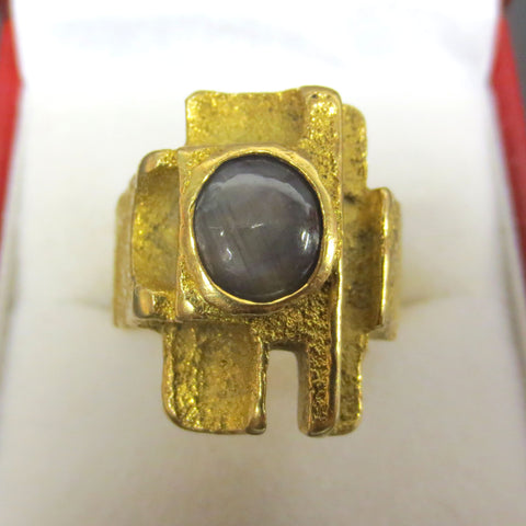 GIA certified, buyer receives certificate below. Beautiful 2 carats natural grey and blue star sapphire, measures 8 X 7.65 mm, 3.9 mm depth. Ring is handmade and heavy at 15.2 grams, marked 18k, solid yellow gold. Ring is vintage 1960s, brutalist design school, Signed "LP" for Louis Perrier a renowned jeweler in Quebec, Canada. Finger size is a 9, design is 16 X 20 mm on top and band is 9mm wide all around. Certificate is signed and dated December 12th 2016 in Montreal, Canada.