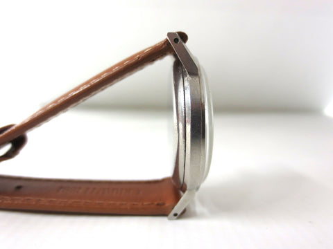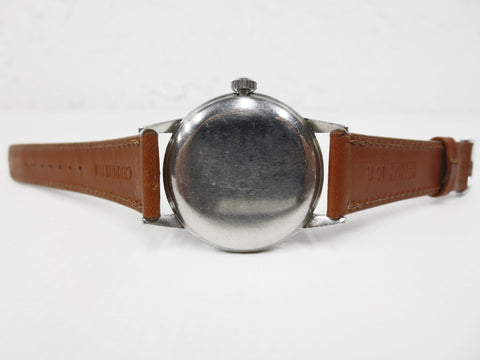 Remarkable condition, serviced, keeps time. Rare original military dial, still glows in the dark. Luxury mechanical watch by Girard Perregaux, Sea Hawk model from the 1940's. Crystal, dial and case are in near mint condition, no scratches, no cracks. Case has a 32 mm diameter, new 16 mm light brown genuine leather band by Cerruti. Ttimeless piece by Perregaux watchmakers.