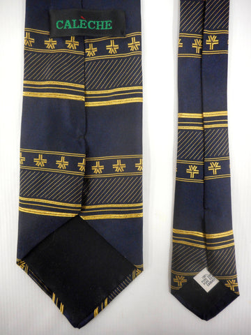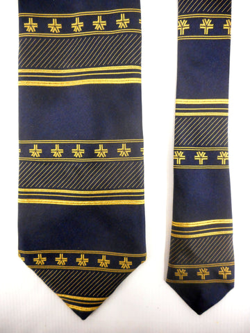 Official Montreal Police service necktie from the 1970's. Shows the SPVM logo (Service de Police de la Ville de Montréal). Dark blue and gold, signed by the designer "Calèche". 100% silk. 55 inches long, 1 1/4 to 3 1/2 inches wide.