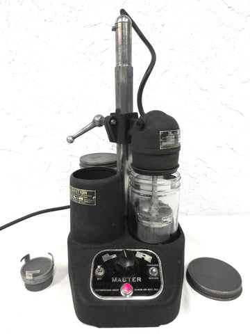 Fully functional, serviced, professionally cleaned. All original accessories in perfect condition: 3 glass jars marked L&R and 10 metal mesh filters. Forward, reverse, knob allows to adjust rotation speed, arm is easy to unlock and rotate.Original metal tags and controls. Made by L& R Manufacturing in Arlington, New Jersey.  Measures 18 x 9 x 12 inches and weighs 16 pounds.