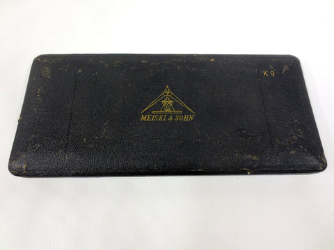 All 3 instruments are complete, very clean, original boxes. The drafting set is signed Meisel & Sohn K9 Gergründet 1882, sturdy case with blue velvet inside, no missing accessories. The 3 sided rule is signed A.W. Faber, Castell, 883/Z1, made in Germany. The 10 inches long Castell slide rule No. 261 is in excellent condition, in its original and clean leather sleeve, names marked by hand inside.