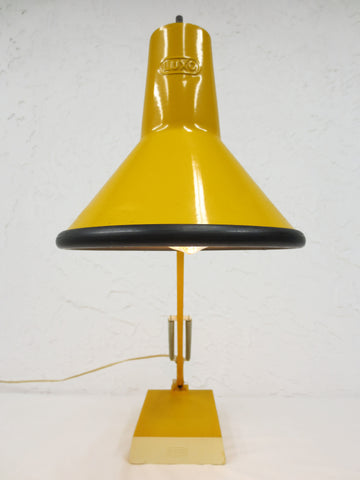 Signed Luxo on both base and shade, fully functional. Original yellow, paint in excellent condition. Base is rare, heavy and lamp is very stable. Beautiful design, Edison style light bulb included. Lamp is 25 inches tall fully extended. Base measures 5 X 8 inches.