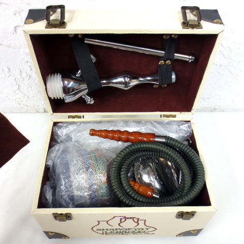 Perfect condition, complete, no signs of use. 18 3/4 inches tall portable shisha tobacco water pipe set in its original luxury Sharqeyat Lebanon handmade box. Includes: