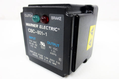 Like new, functional, very clean, no box. Industrial clutch/brake control with 2 indicator lights, 8 pins, model CBC-801-1 by Warner Electric (Altar Industrial Motion). Input: 115 VAC, 50-60 Hz, 170 VA. Output 90 VDC, 1.25 Amps.