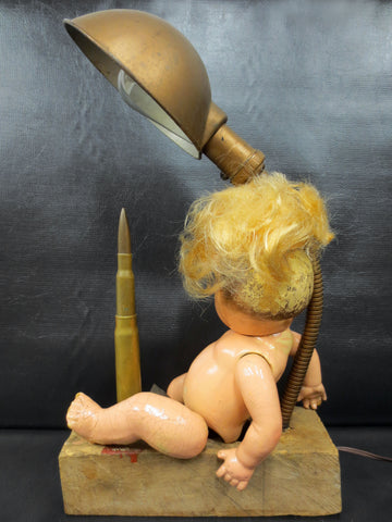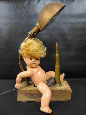 One of a kind, hand made, ready to plug in. Measures 17 inches tall and 10 inches wide. Steampunk and Folk Art desk lamp made with antique artifacts. Baby Donald is an antique composition doll with eyes that open and close and very realistic teeth. Base is a primitive carpenter's wood plane and the gooseneck lamp neck is Art Deco. The "Korean" rocket is a genuine WWII brass shell. The vintage hair is removable as desired and you can move baby Donald's arms. Edison style light bulb included. To help you shed light on "fake news"!